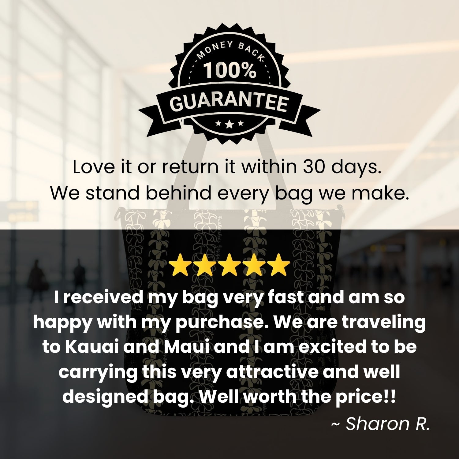 I received my bag very fast and am so happy with my purchase. We are traveling to Kauai and Maui and I am excited to be carrying this very attractive and well designed bag. Well worth the price!!