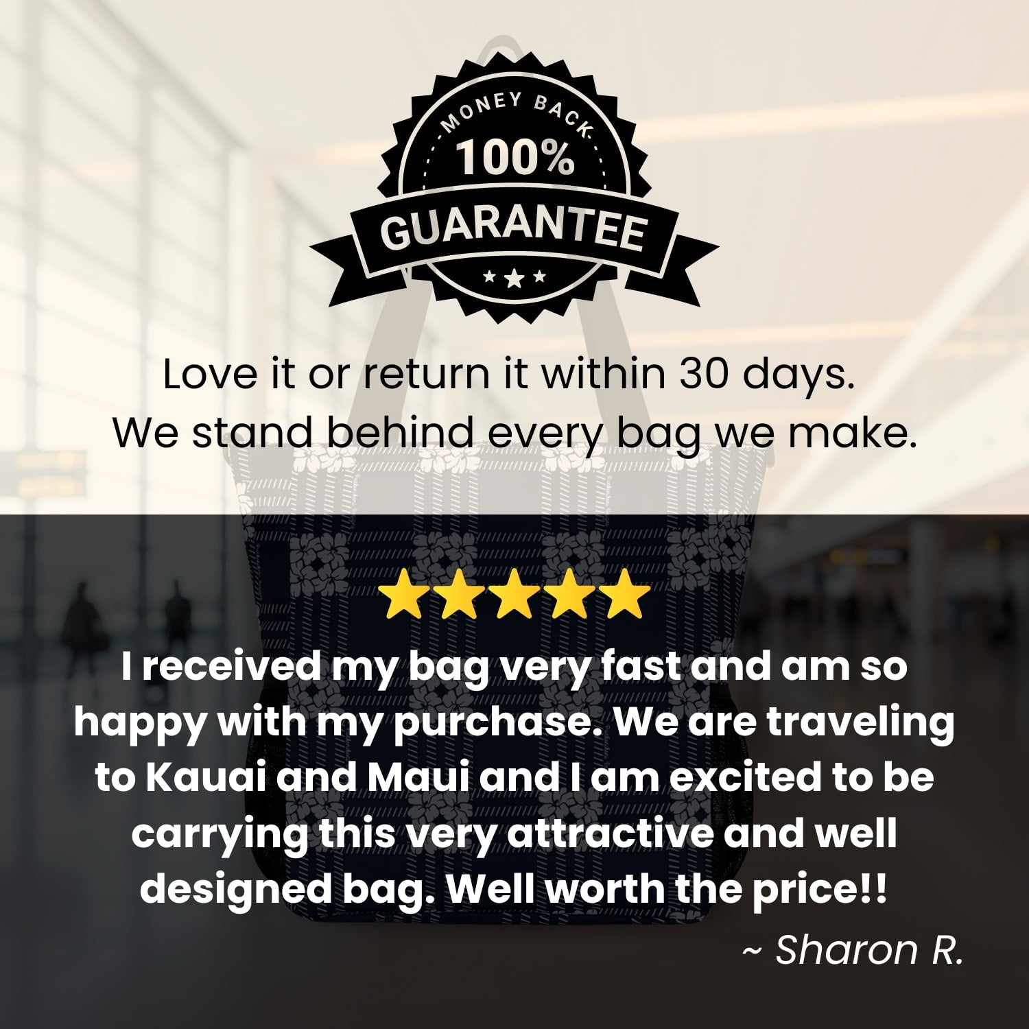 I received my bag very fast and am so happy with my purchase. We are traveling to Kauai and Maui and I am excited to be carrying this very attractive and well designed bag. Well worth the price!!