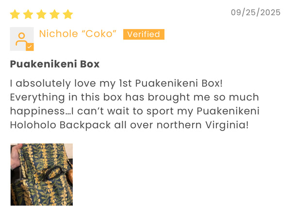 I absolutely love my 1st Puakenikeni Box! Everything in this box has brought me so much happiness…I can’t wait to sport my Puakenikeni Holoholo Backpack all over northern Virginia!